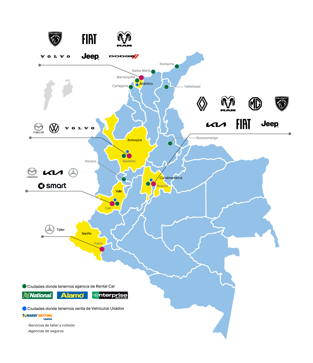Somos parte de Massy Group, un conglomerado con más de 100 años de historia y operaciones en más de 60 compañías en el Caribe, Centroamérica y Sudamérica. El grupo ha construido una reputación basada en la integridad, el servicio excepcional y la creación de valor sostenible. En Colombia operamos desde 2014, consolidándonos como una compañía referente en el sector automotor. Representamos 13 marcas: Kia, Mazda, Mercedes-Benz, Renault, Volvo, Peugeot, Ram, Fiat, Jeep, Volkswagen, MG, Smart y Dodge con venta de vehículos nuevos en Cali, Bogotá, Medellín y Barranquilla. Estos puntos integran además talleres de servicio autorizados, centros de colisión, repuestos, boutique, seguros y vehículos usados, conformando una operación integral.